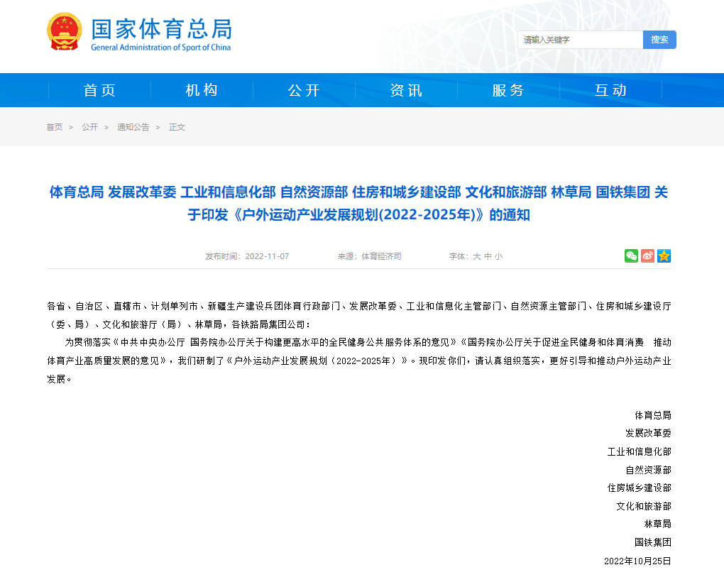 查看详情体育总局 发展改革委 工业和信息化部 自然资源部 住房和城乡建设部 文化和旅游部 林草局 国铁集团 关于印发《户外运动产业发展规划(2022-2025年)》的通知: