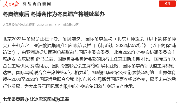 查看详情北京2022年冬奥会正在举办。冬奥前夕,国际冬季运动(北京)博览会(以下简称冬博会)主办方之一亚洲数据集团推出前瞻访谈栏目《莉访谈--2022冰雪对话》(以下简称“莉访谈”),由亚洲数据集团副总裁张莉与国际奥委会委员、北京2022年冬奥会协调委员会主席胡安·安东尼奥·萨马兰奇,国际奥委会奥运会部的执行主任克里斯托弗·杜比,国际雪车联合会主席伊沃·费瑞阿尼,国际滑雪联合会主席约翰·埃利亚施,国际冬季两项联盟主席奥勒·达林,国际雪橇联合会主席埃纳斯·弗格力斯,挪威驻华使馆公使衔参赞汤柯纳,世界体育领袖2000至2020年国际滑雪联合会秘书长莎拉·刘易斯等国际嘉宾畅谈冬奥,展望未来冰雪行业发展,为大家展示国际嘉宾眼中的冬奥筹备印象与奥运遗产传承。